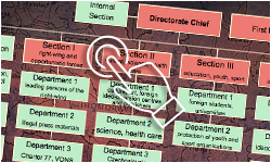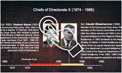 Interactive organisational structure of the Communist foreign intelligence service in the years 1969-1989 (Main Directorate of the foreign intelligence of the Ministry of interior, Directorate I of the Ministry of interior, Directorate I of the Federal ministry of interior, Directorate I of the National Security Corps) with references to closer descriptions of individual units (political foreign intelligence, illegal foreign intelligence, science and technology foreign intelligence, active measures) and subordinated structures. The overview includes selected residenturas of Directorate I where the foreign intelligence operated, with brief descriptions of activities in the given country. The information graphics also include a display of the chiefs of Directorate I on a timescale.